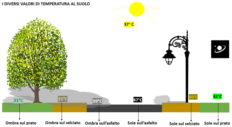 - l'albero in scala 1:100/200 (dimensione min-max) prospetto e pianta con ombra al solstizio d'estate e d'inverno (per calcolare la lunghezza dell'ombra= h albero/tg angolo)