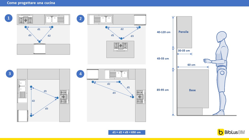 La guida tecnica su come progettare una cucina, con regole compositive, norme, indicazioni per gli impianti e modelli 3D da scaricare
