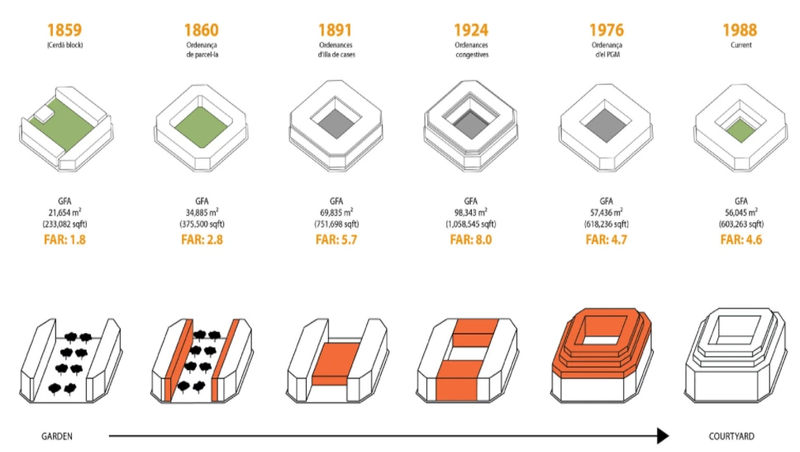 Edificazione su soli due lati: Cerdà non voleva isolati chiusi. Gli edifici dovevano occupare solo due lati paralleli o a forma di "L" (lati contigui), lasciando gli altri lati aperti per garantire la massima circolazione dell'aria e della luce.