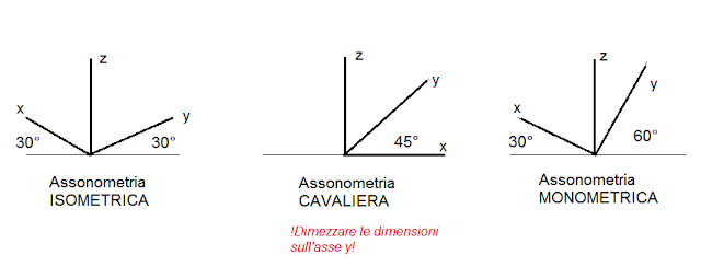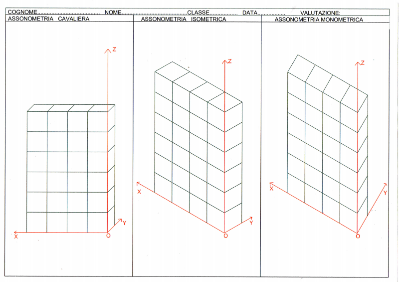 DIVIDETE IL FOGLIO IN TRE PARTI, SCRIVETE IL NOME DELL'ASSONOMETRIA E RAPPRESENTATE GLI ASSI.